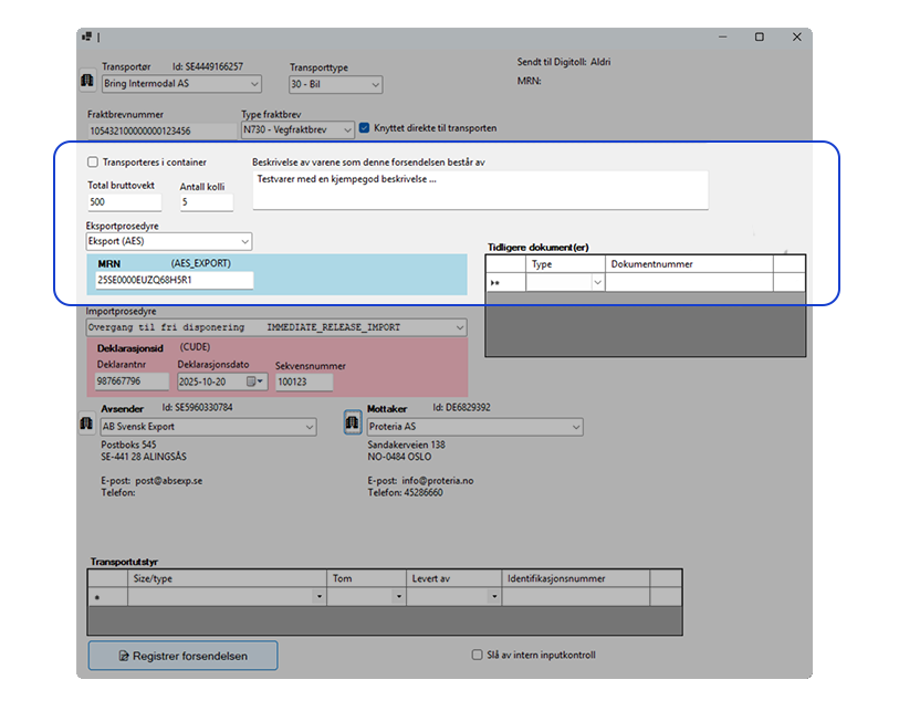 Det må registreres en forsendelse per fraktbrevnummer, og det fylles ut som følger.